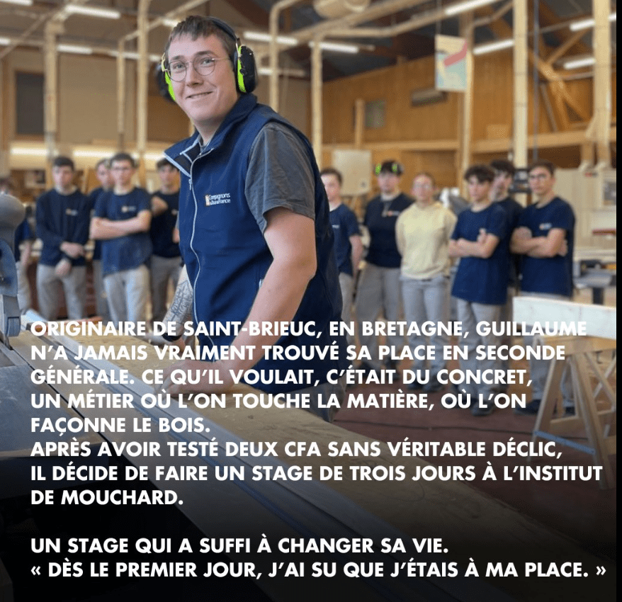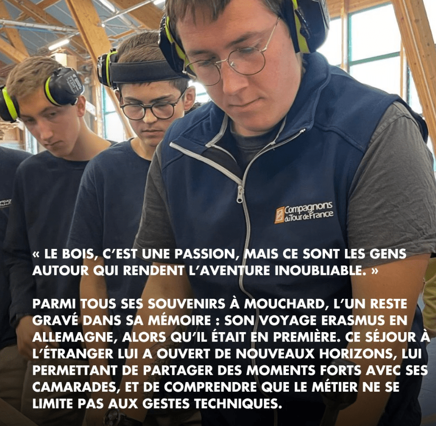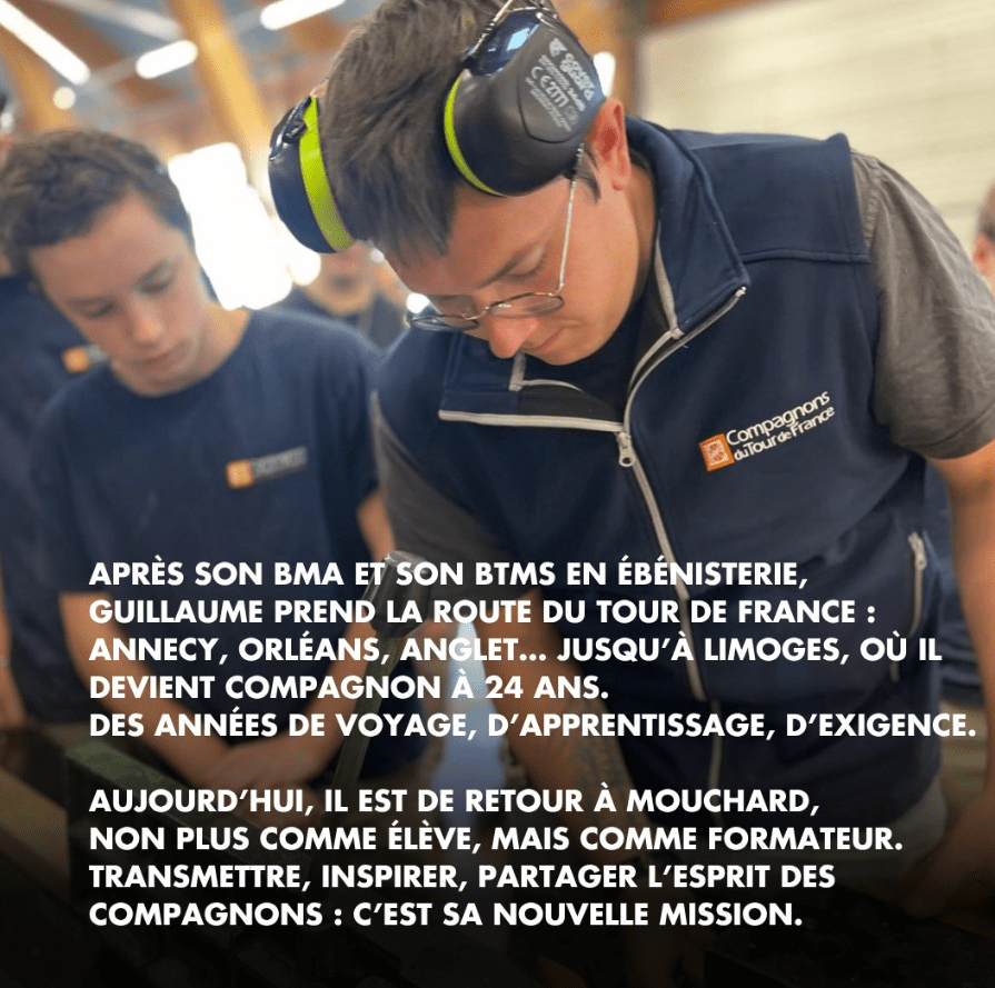 De la Bretagne au Jura, du banc d’école au Tour de France, Guillaume a suivi le fil du bois jusqu’à en faire sa vocation. Ce qu’il cherchait ? c’était du concret.Il a trouvé bien plus : une passion, une famille de métier, une voie qui donne du sens.Apprenti devenu Compagnon, il avance avec la même sérénité que celle qu’il inspire : calme, attentif aux autres comme à la nature qui l’entoure.Aujourd’hui, il revient là où tout a commencé en tant que formateur, prêt à transmettre à son tour l’esprit des Compagnons et l’amour du travail bien fait.SON PARCOURS EN QUELQUES CLICHES CI-DESSOUS